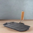 1x Foldable Handle Cast Iron Frying Pan 21x35cm Ridged Bottom Solid Wood Grip